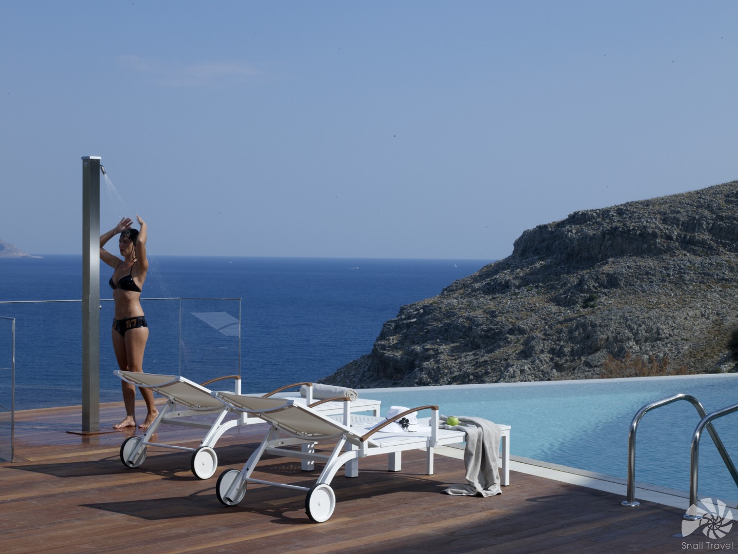 Lindos Blu, hotel – boutique, je vzhledem ke své úrovni, umístění i architektonickému provedení zařazený do kategorie Small Luxury Hotels of the World. Zajišťuje ubytování jen pro dospělé osoby, zejména páry všech generací, které vyhledávají romantické prostředí s vysokým standardem poskytovaných služeb. Dva velké sladkovodní bazény doplňuje terasa, na níž jsou klientům k dispozici lehátka se slunečníky a plážové osušky, stejně jako na pláži. V oblasti stravování se hotel snaží poskytovat zajímavou nabídku, která uspokojí i náročnou klientelu. Speciality nejen středomořské kuchyně poskytují dvě elegantní restaurace - Five Senses Gourmet a Smeralde à la carte. Nabídku doplňují dva bary, 24 hodin denně lze využít pokojový servis. Pro příznivce sportu je k dispozici prosklená posilovna s krásným výhledem, kde si můžete s profesionálním trenérem domluvit program na celý pobyt. Během pobytu můžete si můžete zahrát tenis, příznivcům golfu je určena nabídka klubu Afandou, který je vzdálen necelých 30 kilometrů od hotelu. Vybavení hotelu Lindos Blu doplňuje zlatnictví a minimarket.